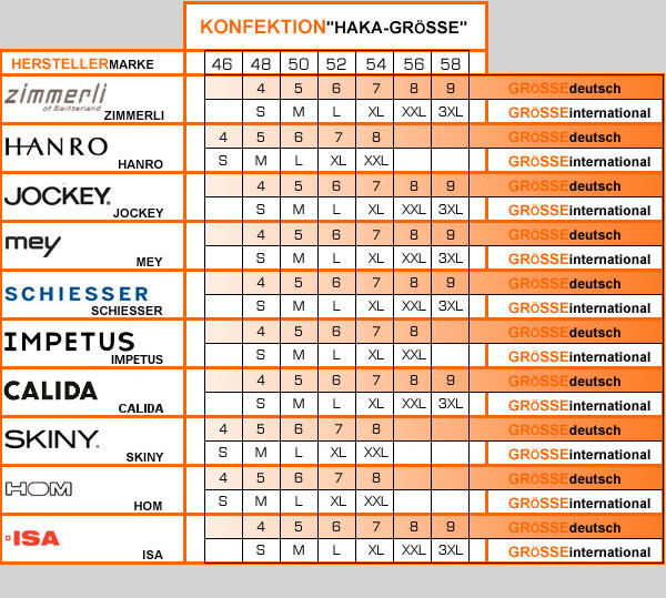 Aus der untenstehenden Liste können Sie Ihre Wäschegröße via Kleidungs-Konfektion ableiten:
